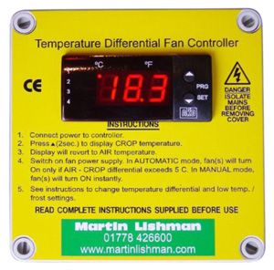Автоматически контролирует любой тип и количество вентиляторов для охлаждения культур во время вентиляции. Датчики измеряют температуру воздуха и урожая. Если температура культуры на 5 ° C выше температуры воздуха, вентиляторы включаются (см. График ниже).