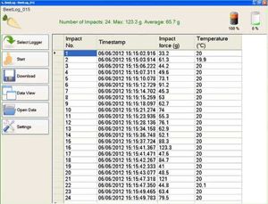 Принцип работы: 3-осевой датчик удара с частотой дискретизации 3000 Гц, выбираемым периодом измерения и предустановленным порогом пикового значения. Считывание данных осуществляется по беспроводной связи через интерфейс Bluetooth или USB-подключение к ПК (с помощью прилагаемого программного обеспечения), планшету или смартфону Android (с помощью приложения, поставляемого или загружаемого из магазина Google Play).