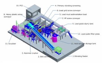 Линия переработки аккумуляторов предназначена для переработки «смешанных» отработанных аккумуляторов с внешней оболочкой из полипропилена и/или эбонита. Отработанные свинцовые аккумуляторы проходят предварительное дробление для удаления кислоты, вторичное дробление, вибросито, гидросепаратор, предварительную десульфурацию, удаление тяжелых металлов, кристаллизацию Na2S04.
