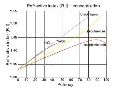 Примеры графиков преломления для ряда жидкостей – сахарозы, черного ликера, серной кислоты, соляной кислоты, щелочи.
