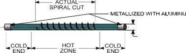 Спиральные карбидкремниевые нагреватели изготовлены из специального карбида кремния высокой плотности с реакционной связью. Спиральная щель в горячей зоне уменьшает площадь поперечного сечения. Спиральный разрез в горячей секции увеличивает длину и уменьшает поперечное сечение пути тока, образуя область с высоким сопротивлением, где рассеивается большая часть резистивного тепла. Это обеспечивает высокий коэффициент электрического сопротивления для охлаждения концов и нагрева горячей зоны. Специальные холодные концы могут быть приварены для дальнейшего повышения коэффициента сопротивления. Для обеспечения контактной поверхности с низким сопротивлением концы металлизированы алюминием. Электрические соединения выполнены с помощью плоских алюминиевых оплеток и пружинных зажимов. Концевые концы элемента SG обычно заглушены.